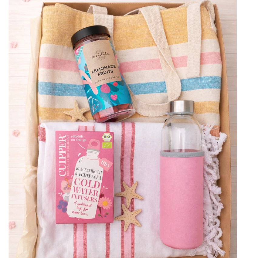 Ajándékdoboz nyárra, vízpartra. Különleges, ötletes köszönetajándék tanév végére. A csíkos, spanyol strandtáskába csak bedobod a vizes palackot, beleteszel egy hideg vizes tea filtert és pár gyümölcsöt a limonádés gyümölcsökből és már kész is a nyári italod, napozás mellé, cukormentesen. Válassz hozzá kísérőkártyát és írj egyedi köszönőszöveget! Ha anyák napjára vagy tanévvégi ajándéknak, pedagógusoknak választod és szeretnéd személyre/osztályra szabni a szöveget :válassz a kiegészítő termékeknél található címkékből, tedd a kosárba és megjegyzésben a rendelésnél add meg a választott kártya számát és a szöveget! |