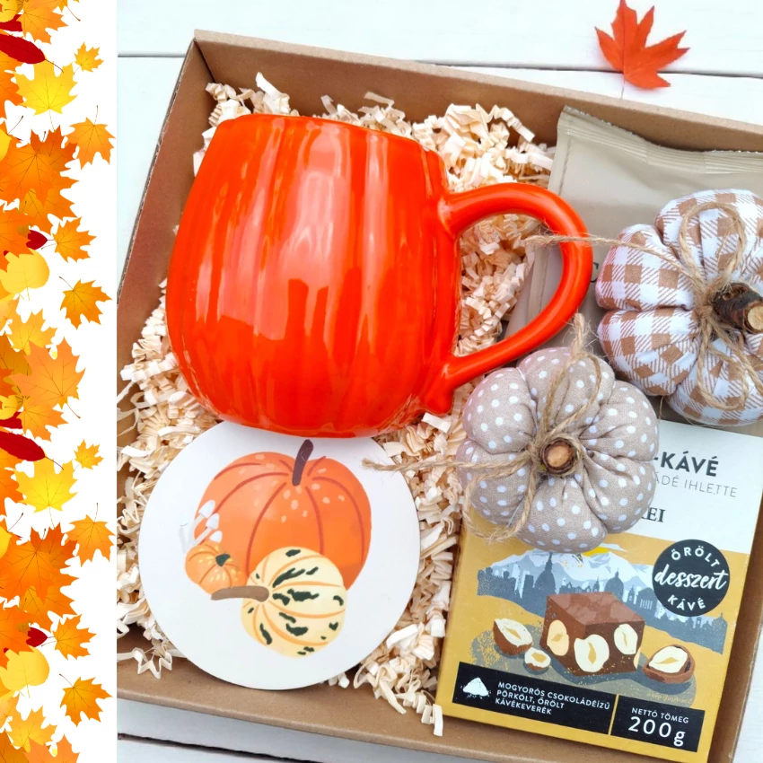 A kedves, tök formájú bögre mogyorós, csokis kávéval és kézzel varrt, mintás vászontök dekorral szuper őszi ajándék. Kiegészítheted egy klassz őszi könyvvel! Magadnak vagy ajándékba? Akciókért kövesd az Instagram oldalunkat és iratkozz fel hírlevélre! MINDEN ŐSZI BOXRA 5% KEDVEZMÉNY +INGYENES FOXPOST SZÁLLÍTÁS 2025.10.18.-25. KÖZÖTT: KUPONKÓD A KASSZÁNÁL: ŐSZFOX |